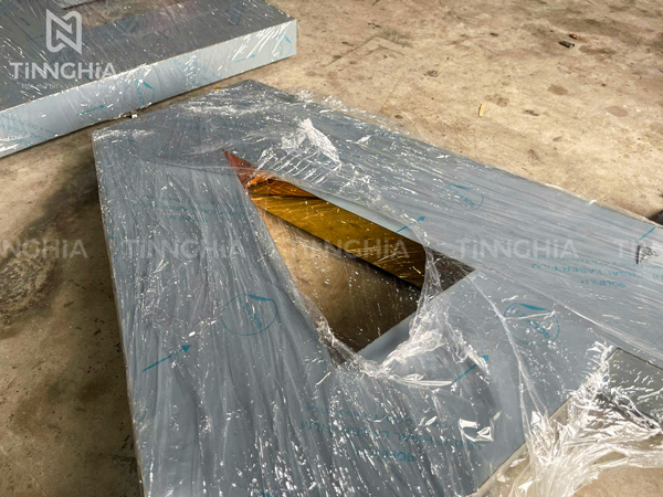 Bảng hiệu chữ nổi inox vàng gương mặt mica
