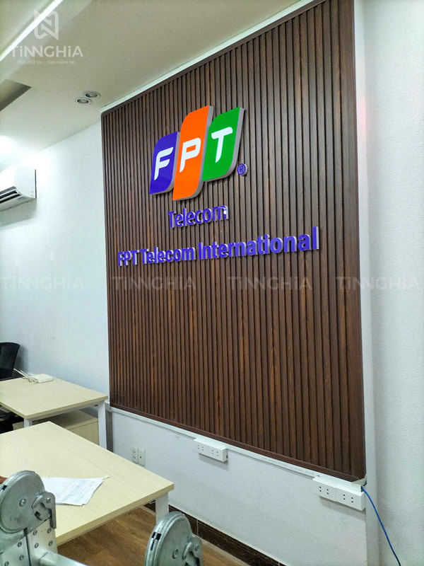 Làm biển hiệu thanh lam nhựa giả gỗ chữ nổi mica gắn tường văn phòng (FPT Telecom Bình Dương)