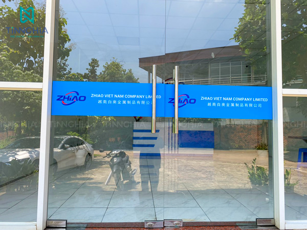 - Decal dán kính mờ cắt logo, cắt tên: Decal in logo không chỉ trang trí mà còn giúp khách hàng dễ dàng nhận diện thương hiệu khi đến văn phòng.